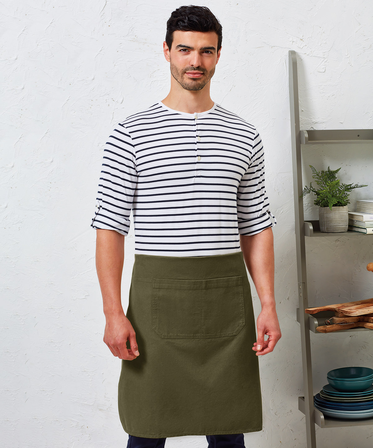 Heavyweight canvas bib apron that can also be folded down to form a half-waist apron. Rounded edges. Gunmetal/antique brass eyelets. Mitred double pocket. Adjustable knotted neckband and matching waist ties that can be fastened to the front or back. Cotton-rich with certified recycled polyester.