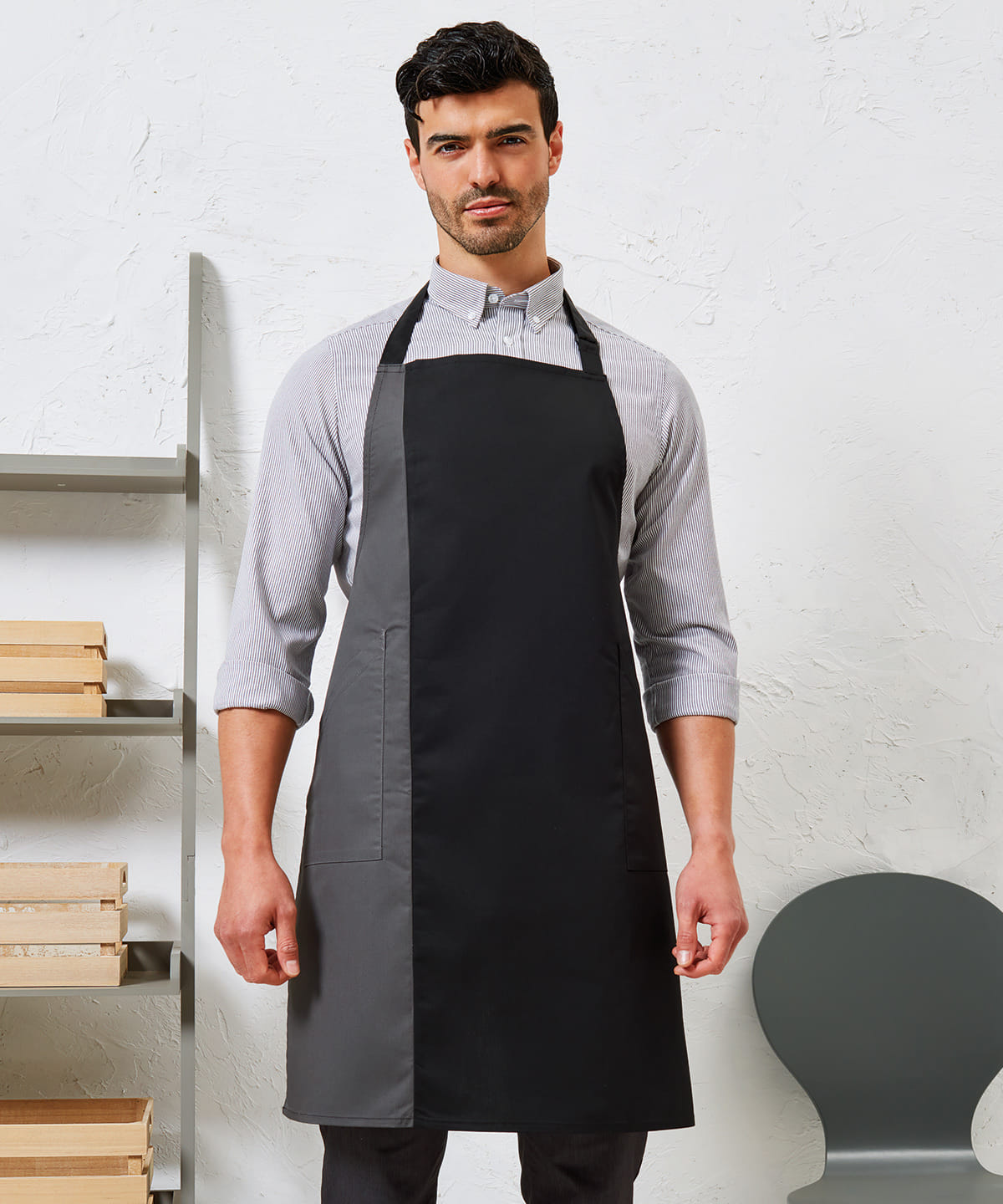 Classic Premier bib apron with contrast coloured panel. Self fabric neck. Self fabric ties 90cm long, width 72cm, length 86cm. 60C domestic wash. Sliding adjusting buckle. Two front side pockets with slanted opening.