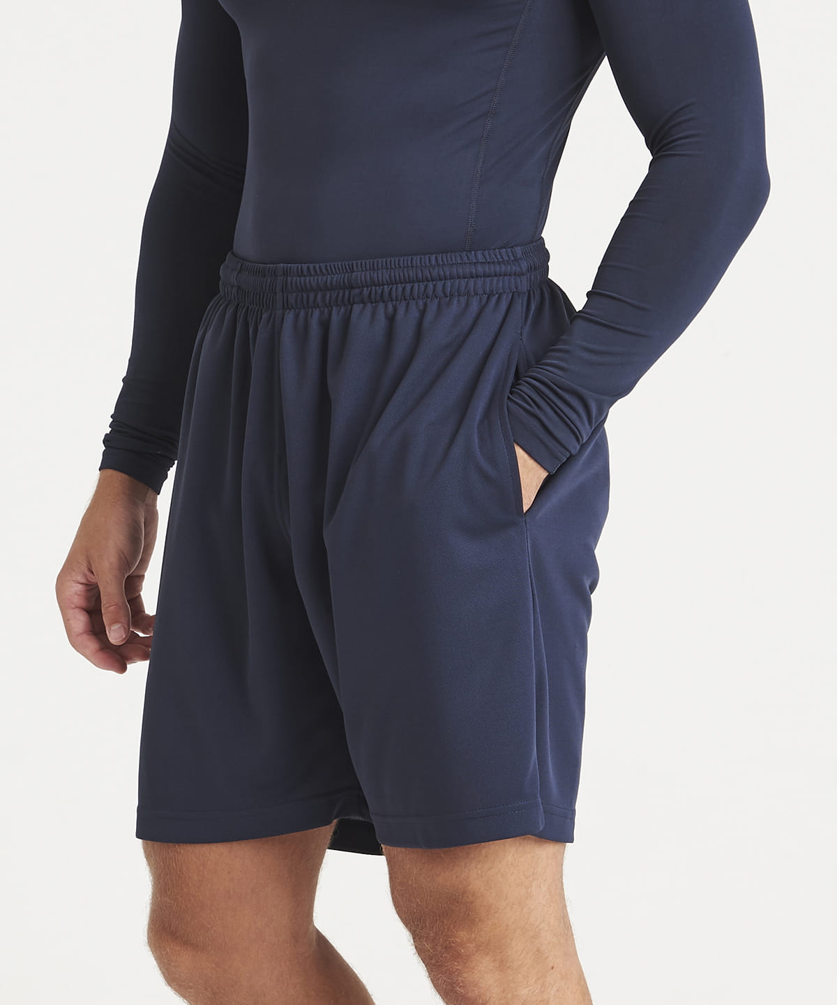 Elasticated waist. Mini mesh lined inner with drawcord. AWDis’ own Neoteric textured fabric with inherent wickability and quick drying properties. Side pockets. Internal key pocket. UPF 30+ UV protection.