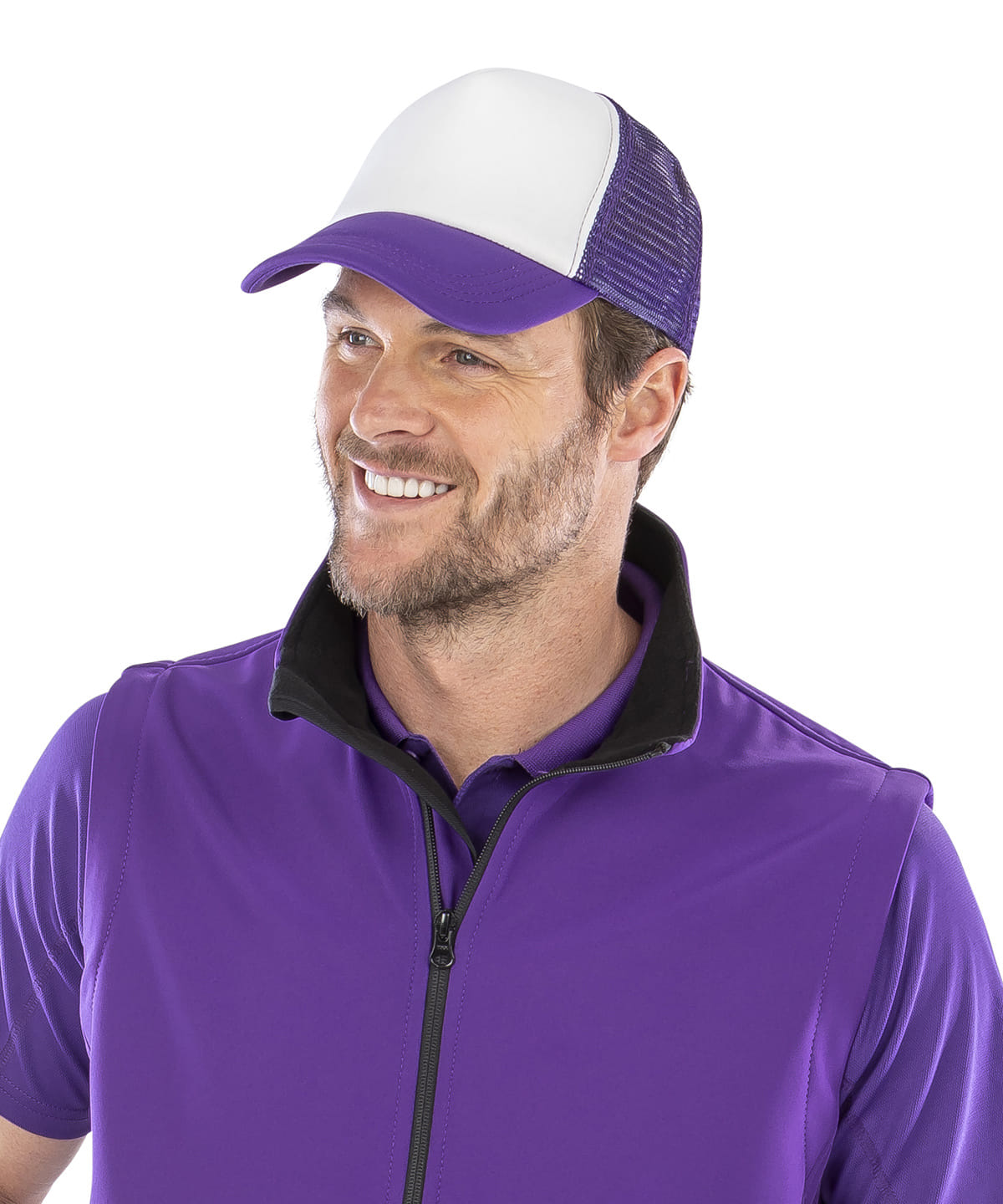 5-panel cap (4 mesh/1 fabric). White front panel with colour contrast mesh and peak. Snapback adjuster. Semi- curved fabric peak made from plastic. Tear-away label.