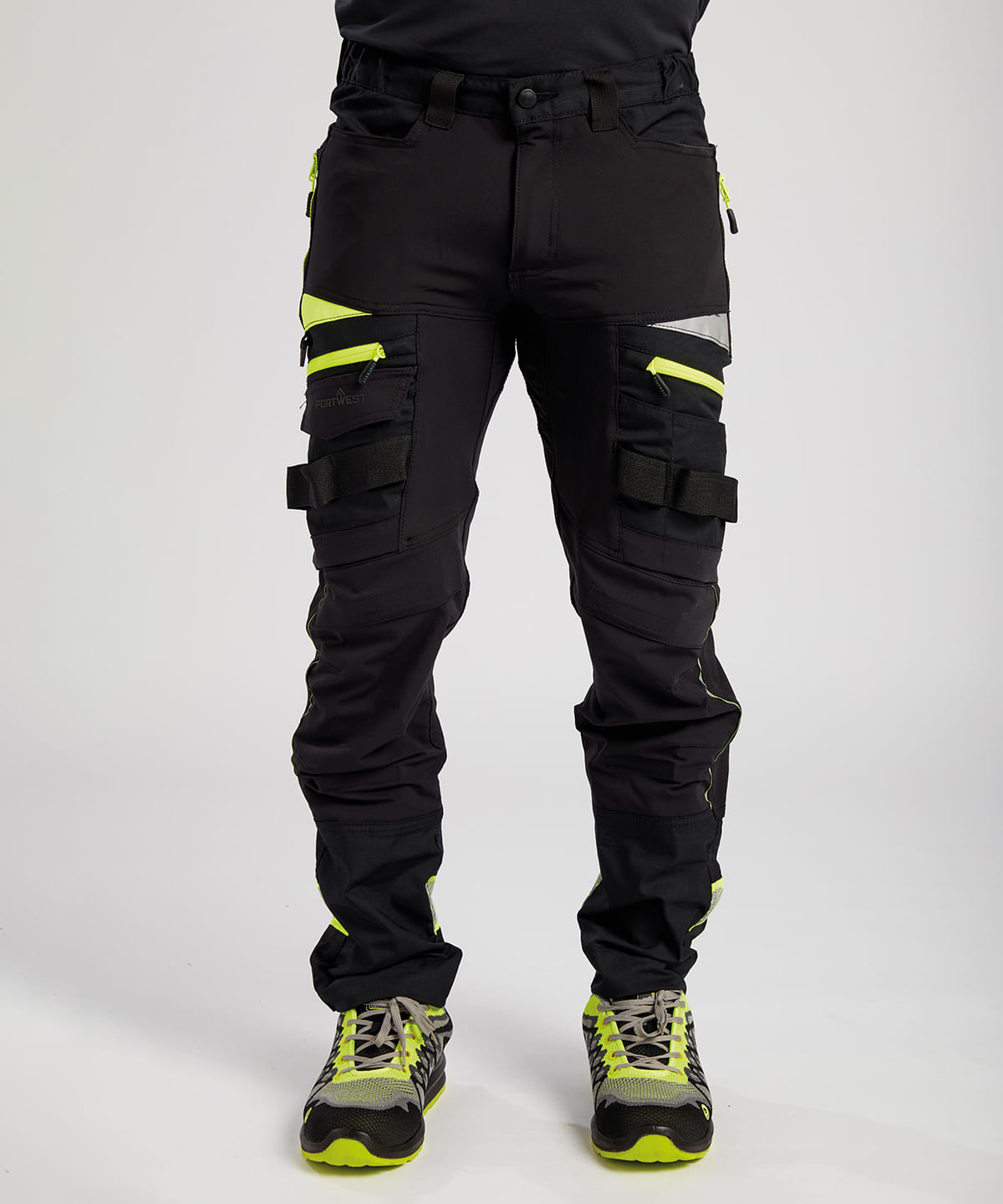 Four-way stretch fabric for ease of movement and added comfort. High-rise back waistband ensures protection in all working positions. Reflective trim for increased visibility and safety. Two-tier kneepad pockets allow two positioning options. Easy grip pullers are attached to all zips. Multiple side zip compartments for secure storage. 11 pockets for ample storage. Two side pockets. Two side zip pockets for secure storage. One phone pocket. Two back zip pockets. One welt pocket. CorePro reinforced thigh pocket. Hammer loop for secure storage of work tools. Side elastic waist for ultimate wearer comfort. Pre-bent knees allow for increased freedom of movement. Crotch gusset to reduce stress and prevent seam failure. Zip fly with Portwest branded stud button. Slim fit design for exceptional comfort. Bartacked at all stress points. Triple-stitched seams for extra durability. 40+ UPF rated fabric to block 98% of UV rays. Extendable leg length (31″ to 33″).