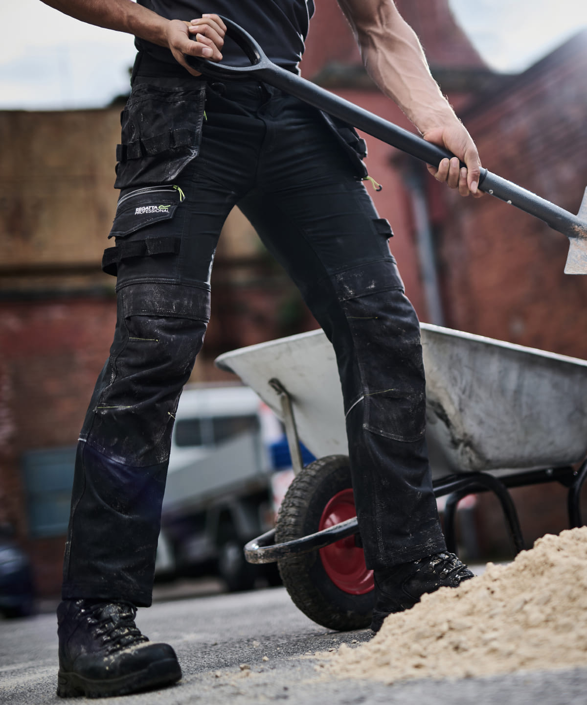 Woven stretch softshell fabric. Ripstop stretch fabric to outer thigh, lower leg, and seat panels. Durable water-repellent finish. Wind-resistant. Cordura top-loading knee pad pockets. Reinforced seams with triple stitching. Reinforced crotch seam. Easily accessible foldaway ‘Holster’ pockets with multiple compartments. Multi-function tool and mobile phone pockets on legs, two front pockets, two rear pockets. Shaped high back waistband for comfort. Inner anti-slip waistband print. Reflective piping to the rear of the legs. Slim fit design. Belt loops. D-ring attachment. Reinforced hem overlays. Made using recycled materials.