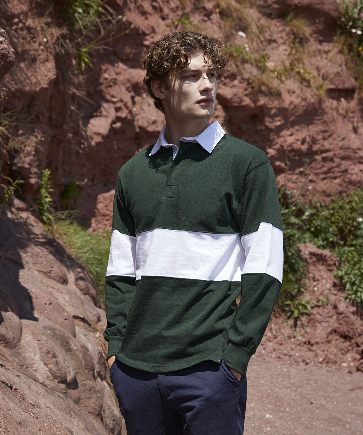 Tag free retro fit rugby shirt. Cut and sew contrast stripe panel around centre. Heavyweight single Jersey. Contrast traditional woven (twill) rugby collar. Herringbone back neck tape. Contrast herringbone taped side vents. Taped shoulders. Elastane reinforced ribbed cuffs for shape retention. Twin-needle hem. Topstitching at armholes and panels. Concealed button placket. Herringbone inner placket. 2 x rubber buttons.