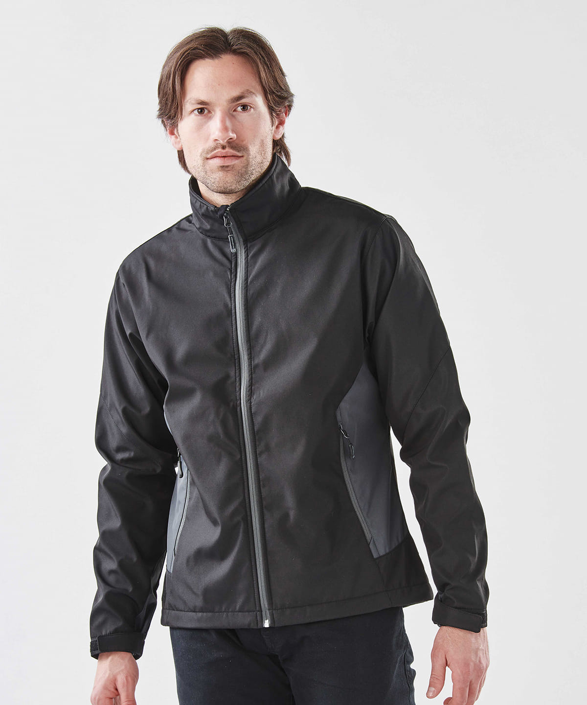 Two-tone bonded sport softshell with soft, lightweight lining, designed to maximize comfort and mobility with an interior storm placket, chin saver, and a Stormtech showerproof D/W/R finish for lasting weatherproof protection.
