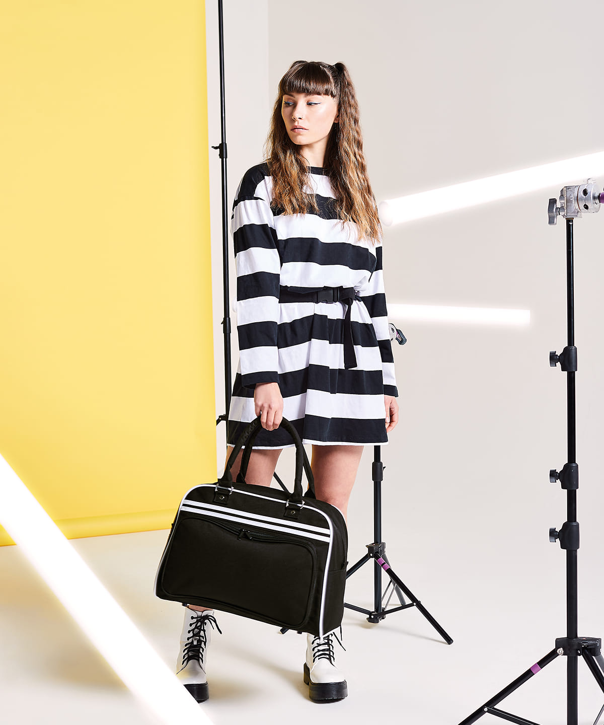 Retro styling. Self fabric carry handles. Zippered front pocket. Zippered internal pocket. Internal mesh pockets. Internal baseboard. Protective base feet. Can be carried by hand or over the shoulder. Contrast detailing. Reach certified.