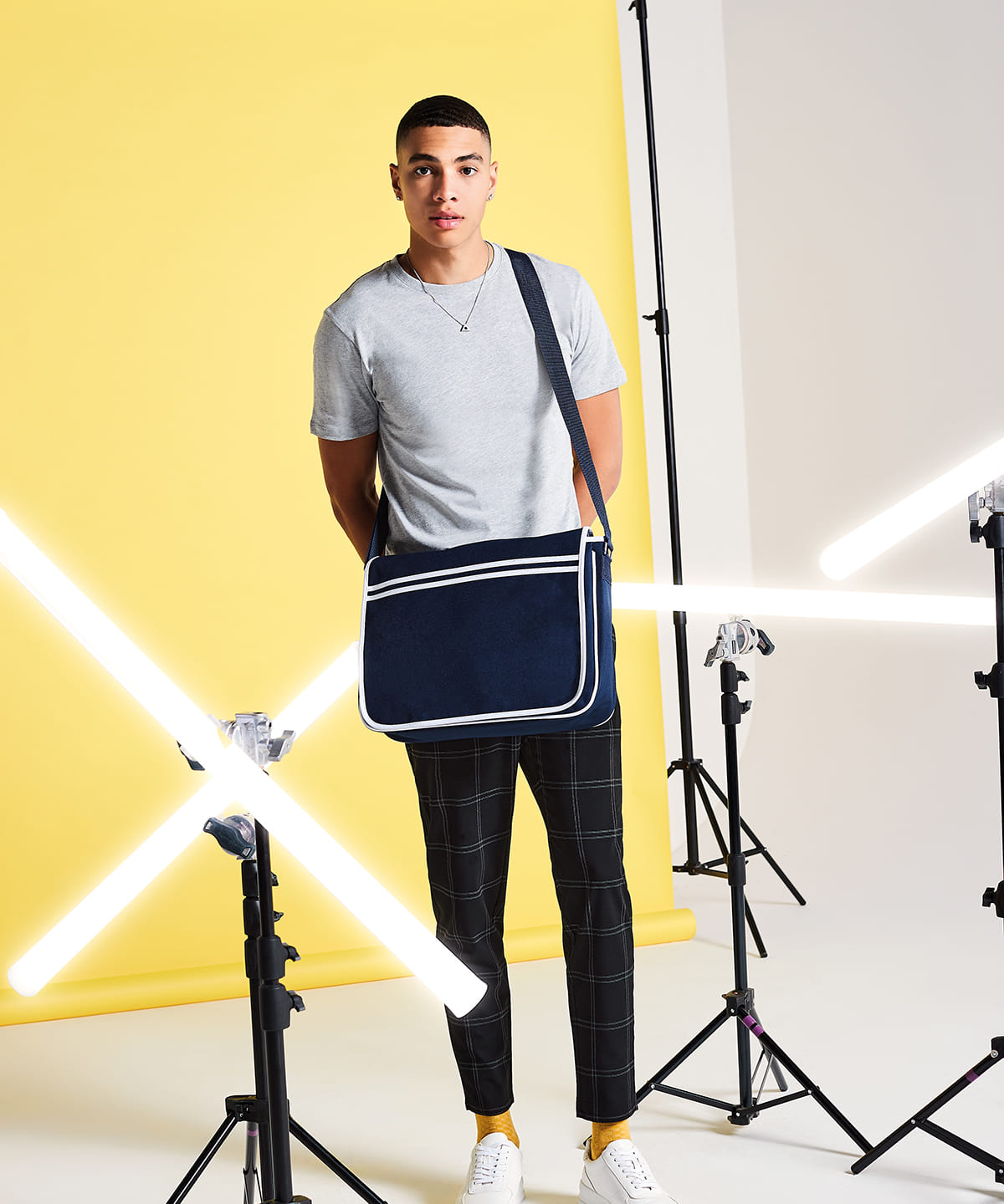 Retro styling. Adjustable shoulder strap. Zippered mesh pocket under flap. Rip-Strip closure. Contrast detailing. Reach certified.